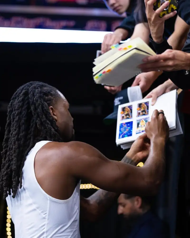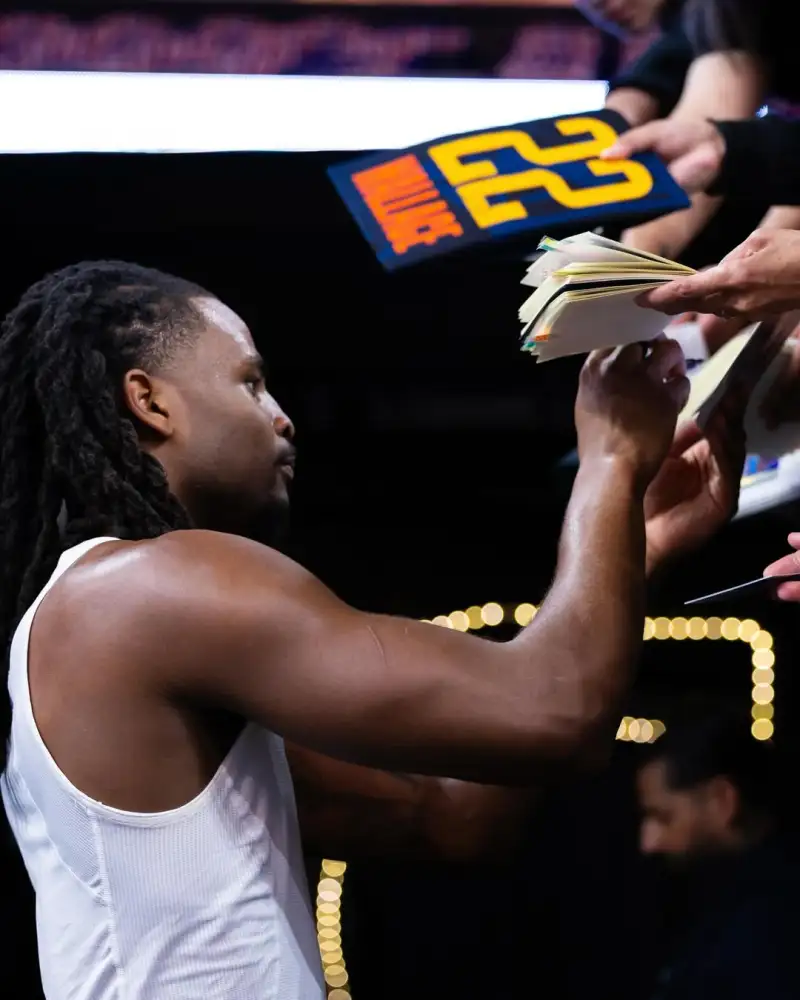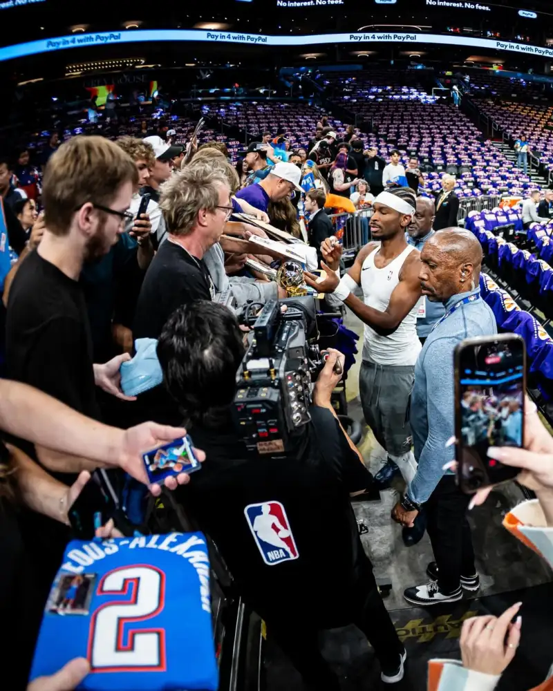 雷霆社媒晒出亚历山大、哈腾和华莱士热身结束后为客场球迷签名并合影的瞬间。